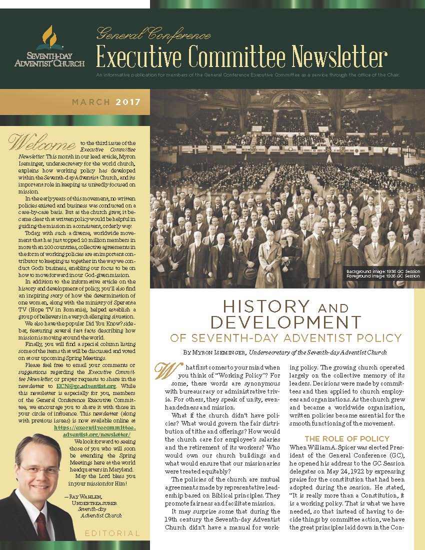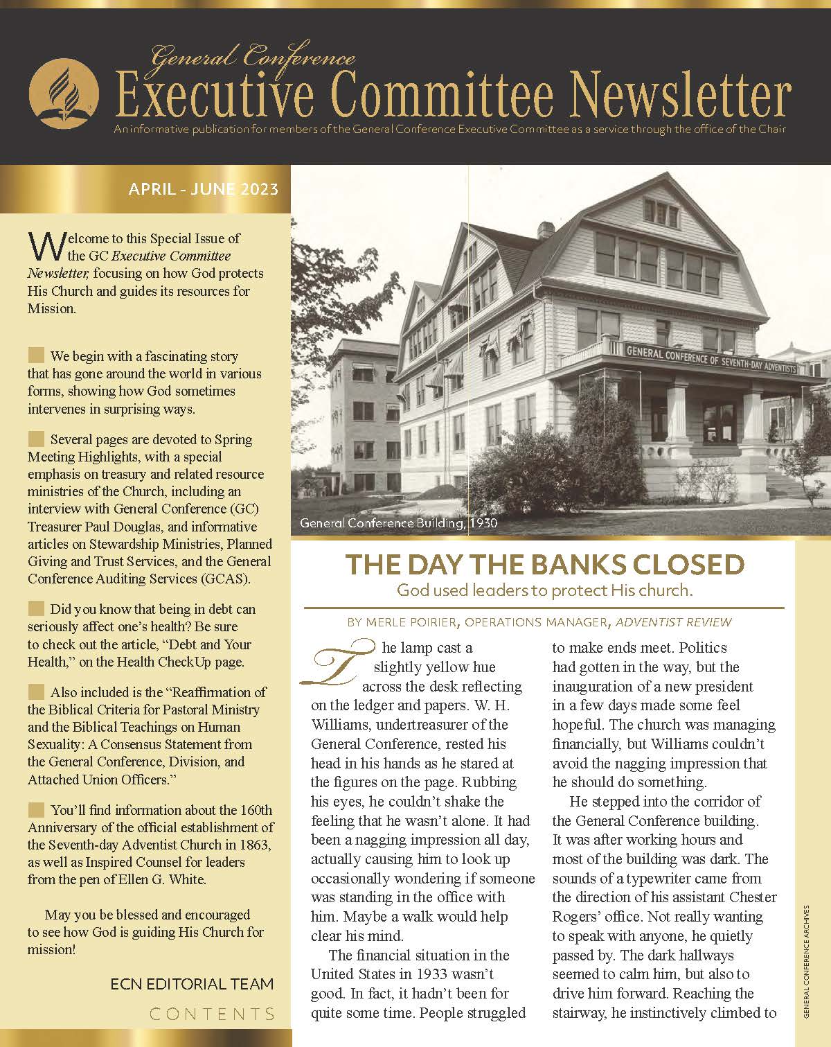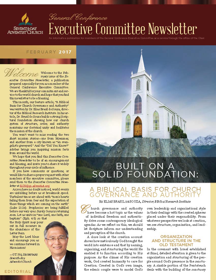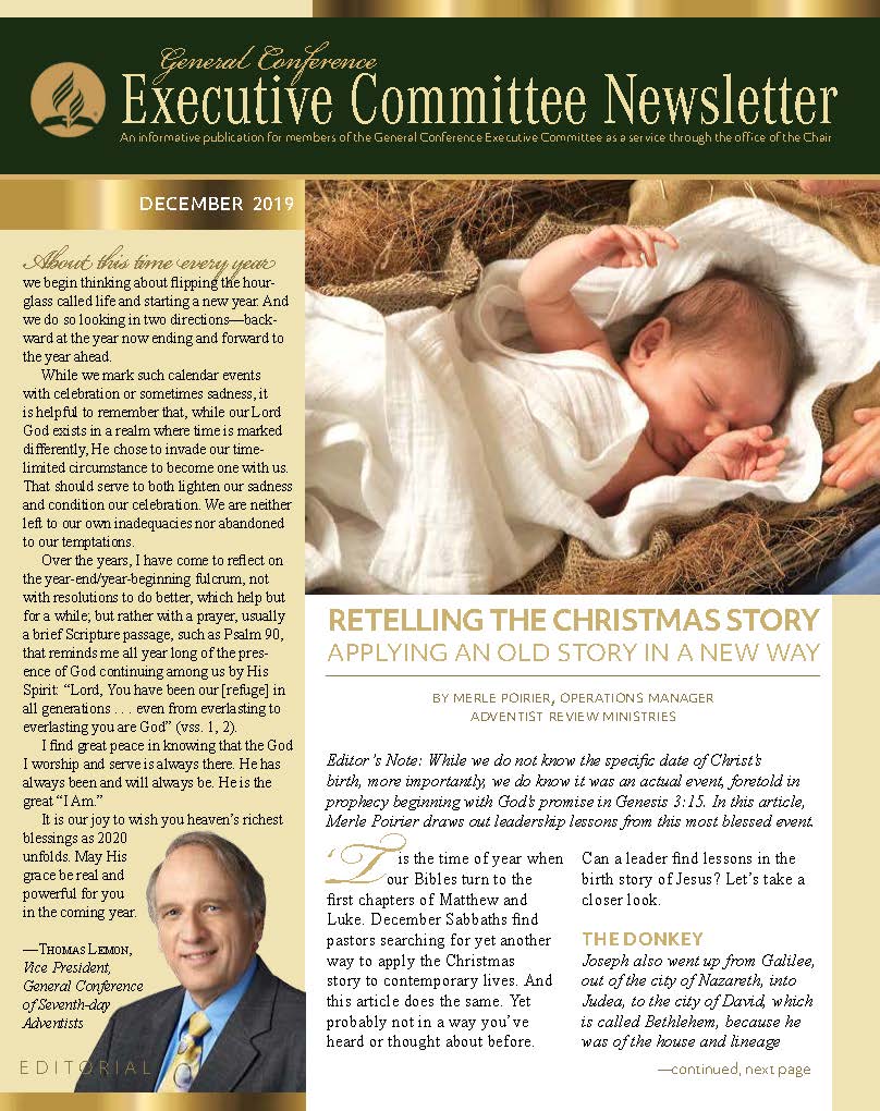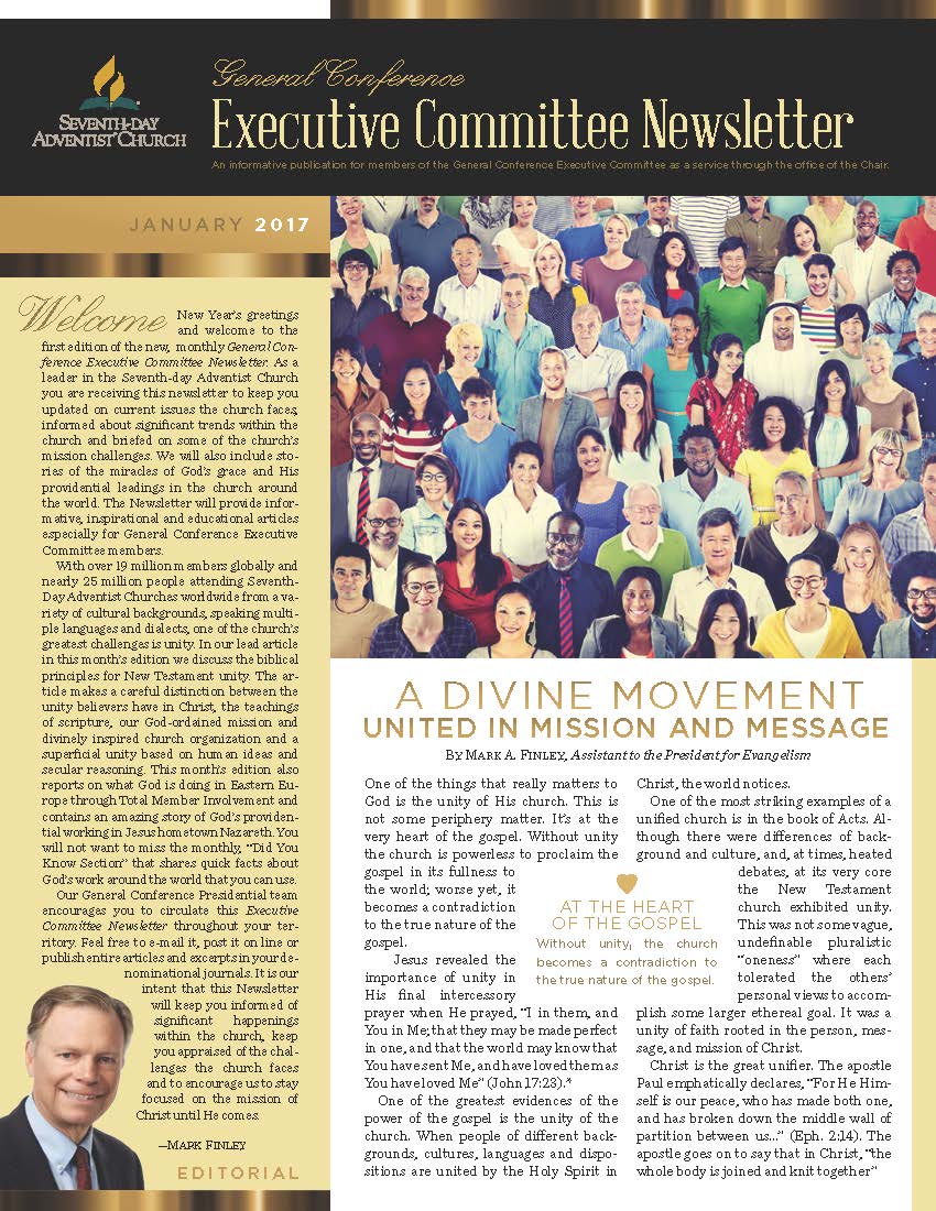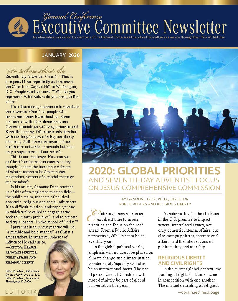 The General Conference Executive Committee Newsletter (ECN) is a publication for members of the General Conference (GC) Executive Committee. It is filled with solid, informative, biblically-based, inspiring content, addressing topics of interest for the worldwide leaders of the Seventh-day Adventist Church. The newsletter, which began in 2017, is currently a quarterly publication and is sent regularly to all members and invitees of the GC Executive Committee. It is also posted regularly on the Executive Committee website. Due to increasing requests, a free subscription to the newsletter is now available to everyone who requests it. If you would like to be put on the ECN mailing list, simply fill out the form on this page. Your name and email address will be protected and will only be used for sending you the ECN.